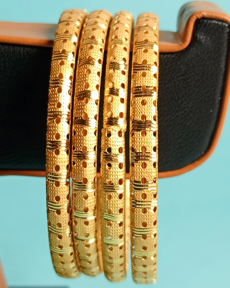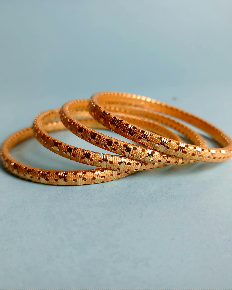 A quartet of elegance, Chaar Sitare features four intricately textured gold bangles that blend tradition with modern finesse. Each bangle showcases a harmonious pattern of circular cutouts and engraved lines, creating a rhythmic play of light and shadow. Lightweight yet bold, this imported set is perfect for those who seek understated luxury with a touch of artisanal charm. Whether worn together or paired with other pieces, these bangles elevate any look with quiet sophistication.