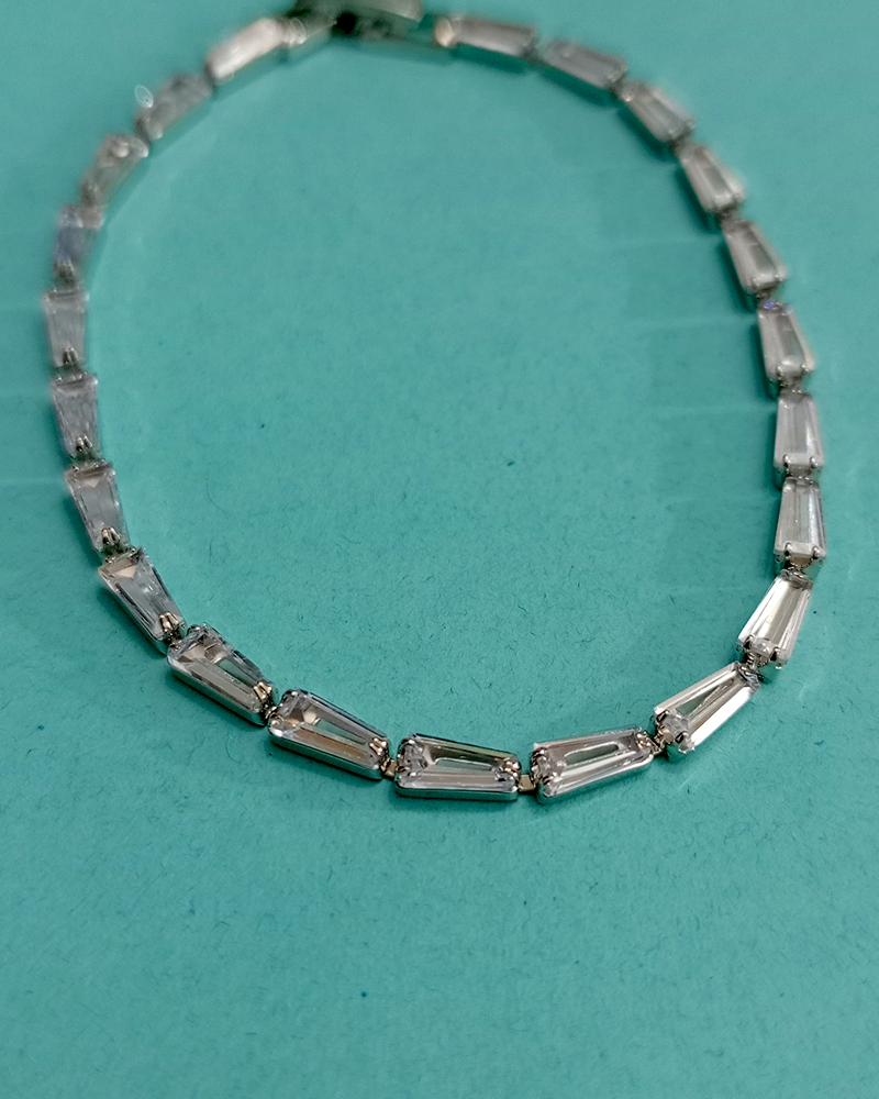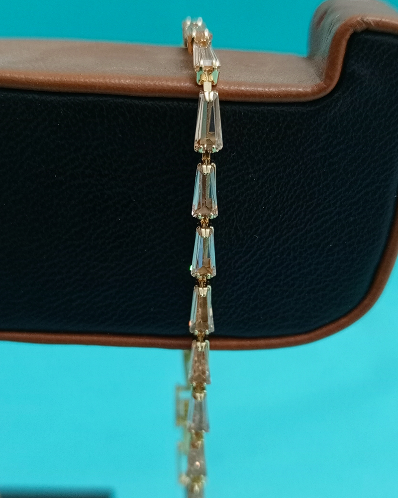 Step into the spotlight with the Tapered Baguette Shimmer Bracelet, a masterpiece of modern geometry and classic brilliance. This exquisite piece features a seamless strand of precision-cut, tapered baguette crystals that create a unique, fan-like reflection with every movement. Whether you choose the warm radiance of the champagne-gold finish or the crisp, icy allure of the silver plating, this bracelet offers a sleek, architectural look that redefines the traditional tennis bracelet.